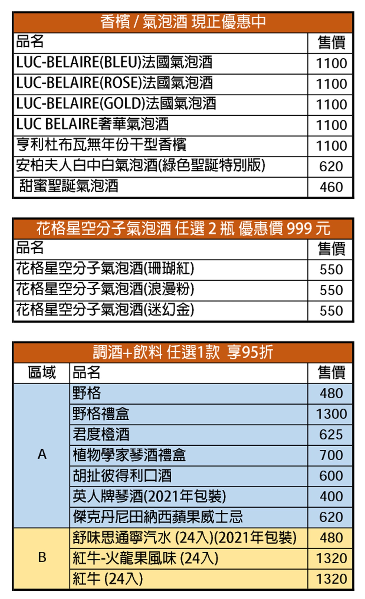 即日起,凡購買指定調酒+飲料,即享95折限時優惠,更多香檳/氣泡酒現正優惠中!